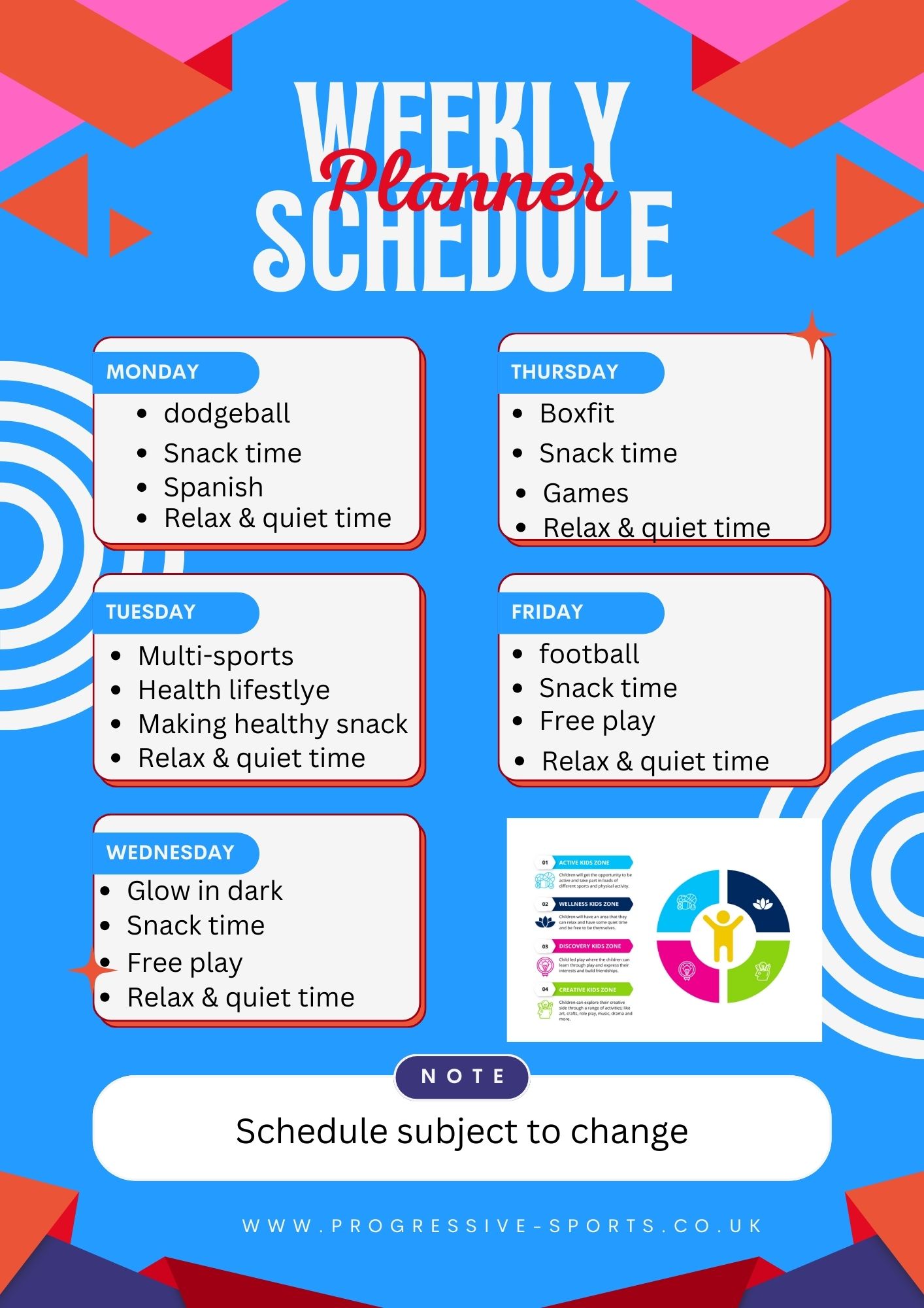 Attached are documents showing the weekly activity schedule and the after school club information provided by Progressive Sports
